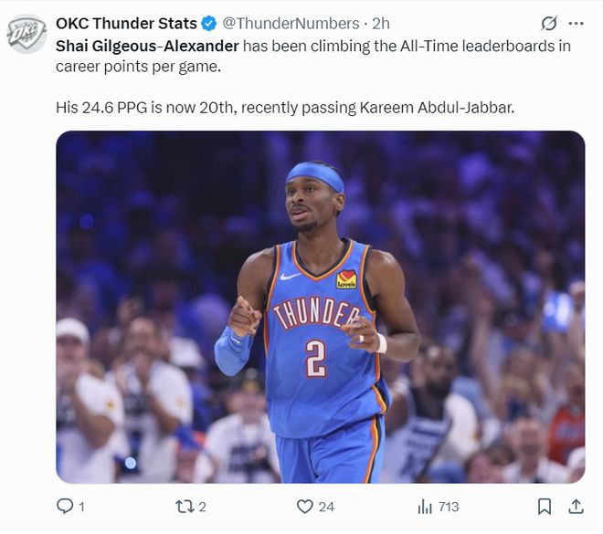 赛前雷霆媒体写道,SGA场均得分已经来到24.6分排在历史第20位超过了天勾贾巴尔。
