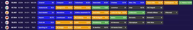 诺丁汉森林(英超)、博洛尼亚(意甲)、斯图加特(德甲)、塞尔塔(西甲)、里尔(法甲)、费伦茨城(匈甲)、帕纳辛纳科斯(希腊超)、亨克(比利时甲)